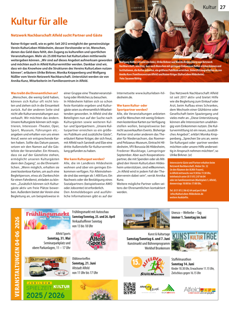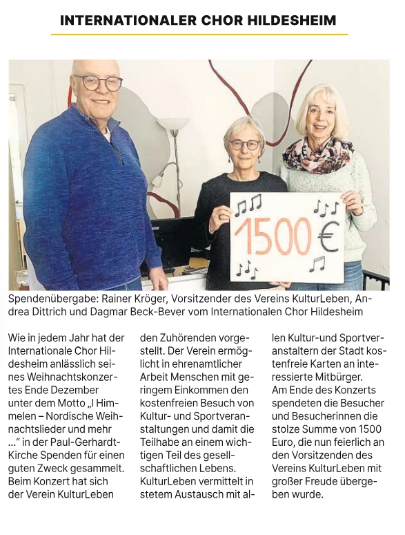 Pressespiegel Februar 2026 Quelle: Hildesheimer Allgemeine Zeitung, 05.02.2026 Januar 2026 Quelle: Leine-Deister-Zeitung, 30.01.2026 Januar 2026 Quelle: Hildesheimer Allgemeine Zeitung (Sarstedt), 16.01.2026 August 2025 Quelle: Hildesheimer Allgemeine Zeitung, 15.08.2025 Mai 2025 Quelle: Leine-Deister-Zeitung, 24.05.2025 Februar 2025 Quelle: Hildesheimer Allgemeine Zeitung (Sarstedt), 25.02.2025 Februar 2025 Quelle: Kleeblatt Sarstedt, 11.02.2025 Dezember 2024 Quelle: Hildesheimer Allgemeine Zeitung, 11.12.2024 November 2024 Quelle: Kleeblatt Sarstedt, 27.11.2024 Oktober 2024 Quelle: Leine-Deister-Zeitung, 08.10.2024 Mai 2024 Quelle: Stadfeld life!, Mai 2024 Mai 2024 Quelle: Rund um Bockenem, 15.5.2024 April 2024 Quelle: Hildesheimer Allgemeine Zeitung (Sarstedt), 6.4.2024 April 2024 März 2024 Quelle: Hildesheimer Allgemeine Zeitung, 27.3.2024 Dezember 2023 September 2023 Quelle: Hildesheimer Allgemeine Zeitung, 19.9.2023 Juli 2023 Quelle: PUBLIC, Hildesheimer Stadtmagazin, Ausgabe 07/2023 Juni 2023 Quelle: Hildesheimer Allgemeine Zeitung (Sarstedt), 28.6.2023 Februar 2023 Quelle: Hildesheimer Allgemeine Zeitung, Ausgabe 18.2.2023 November 2022 Quelle: Ost-Innen Städter, Stadtteilanzeiger, Ausgabe Nov/2022 Juli 2022 Quelle: Wir hier! - Das Familienmagazin der Stadt Hildesheim, Ausgabe 2/2022 Juli 2022 September 2021 Quelle: Hildesheimer Allgemeine Zeitung, Ausgabe 18.2.2023 September 2019 Quelle: Hildesheimer Allgemeine Zeitung, Ausgabe 25. 9. 2019 Unsere Partner